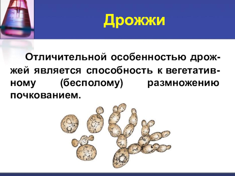 Отличительной особенностью дрож-жей является способность к вегетатив-ному (бесполому) размножению почкованием.