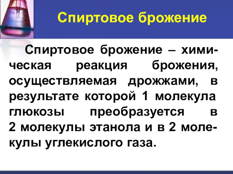 результате которой 1 молекула глюкозы преобразуется в 2 молекулы этанола и в 2 моле- кулы углекислого газа.