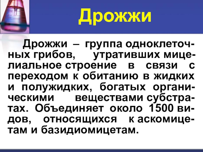 Слайд 42 Дрожжи – группа одноклеточ-ных грибов, утративших мице-лиальное строение в связи с переходом к