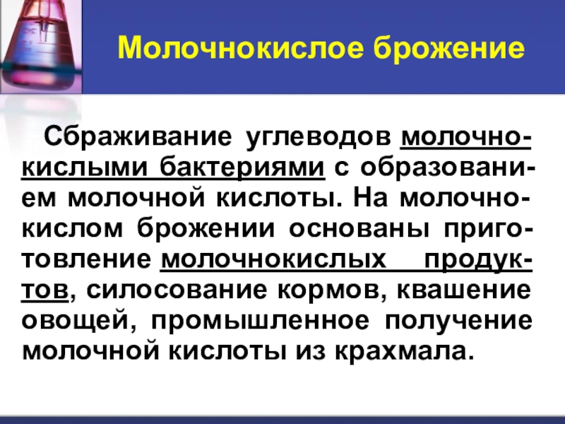 Сбраживание углеводов молочно-кислыми бактериями с образовани-ем молочной кислоты. На молочно-кислом брожении
