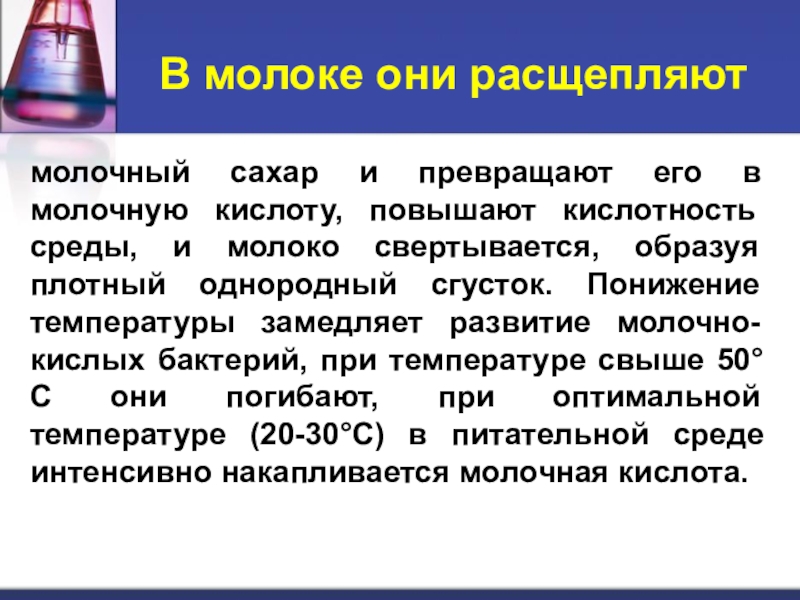 повышают кислотность среды, и молоко свертывается, образуя плотный однородный сгусток. Понижение температуры замедляет развитие молочно-кислых бактерий, при температуре свыше 50°С они погибают, при оптимальной температуре (20-30°С) в питательной среде интенсивно накапливается молочная кислота.