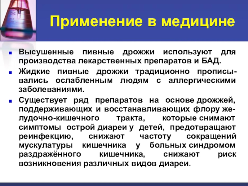Высушенные пивные дрожжи используют для производства лекарственных препаратов и БАД.
