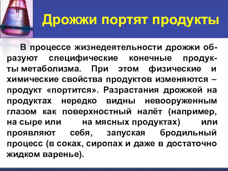 продук-ты метаболизма. При этом физические и химические свойства продуктов изменяются – продукт «портится». Разрастания дрожжей на продуктах нередко видны невооруженным глазом как поверхностный налёт (например, на сыре или на мясных продуктах) или проявляют себя, запуская бродильный процесс (в соках, сиропах и даже в достаточно жидком варенье).