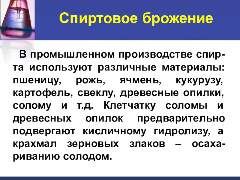 Слайд 10 В промышленном производстве спир-та используют различные материалы: пшеницу, рожь, ячмень,