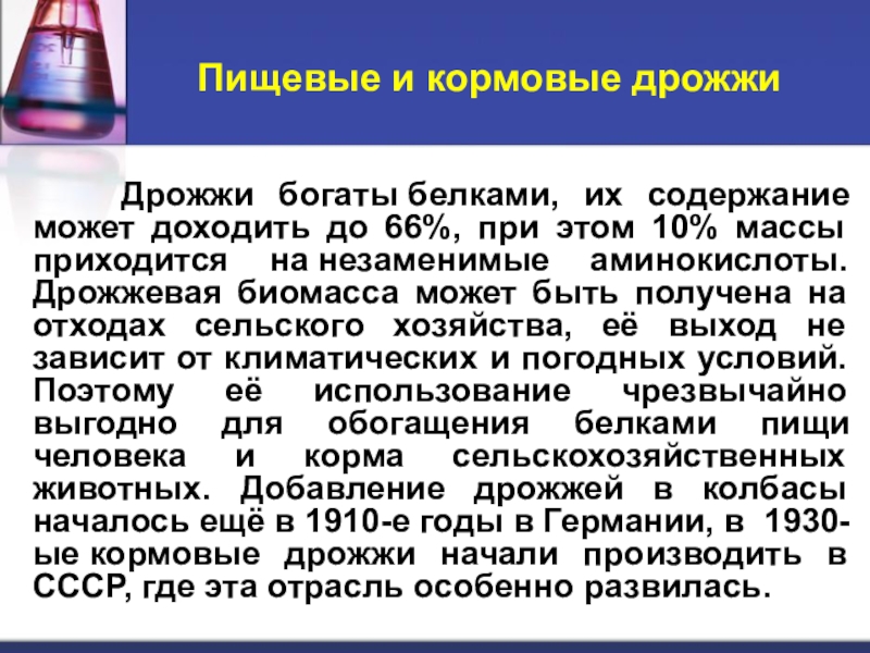 до 66%, при этом 10% массы приходится на незаменимые аминокислоты. Дрожжевая биомасса может быть получена на отходах сельского хозяйства, её выход не зависит от климатических и погодных условий. Поэтому её использование чрезвычайно выгодно для обогащения белками пищи человека и корма сельскохозяйственных животных. Добавление дрожжей в колбасы началось ещё в 1910-е годы в Германии, в 1930-ые кормовые дрожжи начали производить в СССР, где эта отрасль особенно развилась.