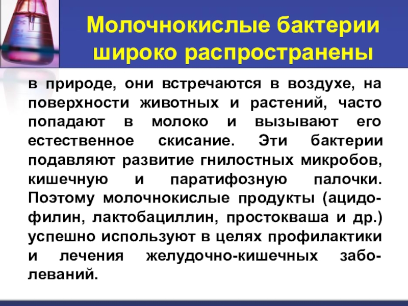 животных и растений, часто попадают в молоко и вызывают его естественное скисание. Эти бактерии подавляют развитие гнилостных микробов, кишечную и паратифозную палочки. Поэтому молочнокислые продукты (ацидо-филин, лактобациллин, простокваша и др.) успешно используют в целях профилактики и лечения желудочно-кишечных забо-леваний.