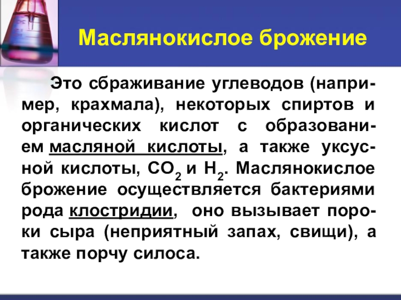 и органических кислот с образовани-ем масляной кислоты, а также уксус-ной кислоты, CO2 и H2. Маслянокислое брожение осуществляется бактериями рода клостридии, оно вызывает поро-ки сыра (неприятный запах, свищи), а также порчу силоса.