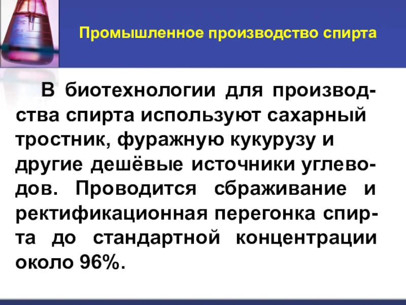В биотехнологии для производ-ства спирта используют сахарный тростник, фуражную кукурузу и другие дешёвые