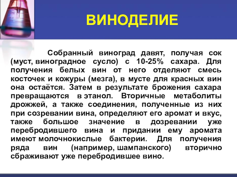 с 10-25% сахара. Для получения белых вин от него отделяют смесь косточек и кожуры (мезга), в мусте для красных вин она остаётся. Затем в результате брожения сахара превращаются в этанол. Вторичные метаболиты дрожжей, а также соединения, полученные из них при созревании вина, определяют его аромат и вкус, также большое значение в дозревании уже перебродившего вина и придании ему аромата имеют молочнокислые бактерии. Для получения ряда вин (например, шампанского) вторично сбраживают уже перебродившее вино.