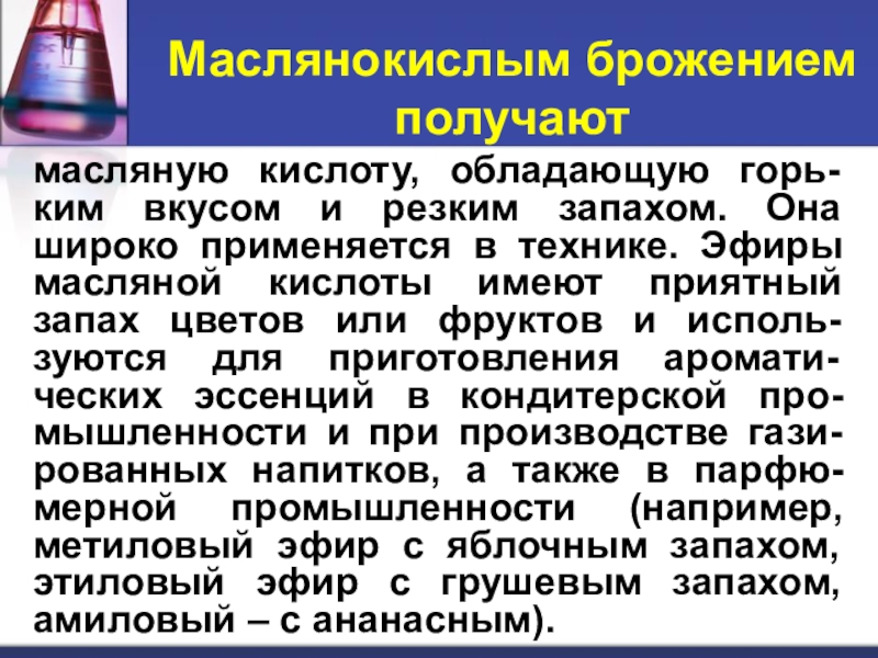 широко применяется в технике. Эфиры масляной кислоты имеют приятный запах цветов или фруктов и исполь-зуются для приготовления аромати-ческих эссенций в кондитерской про-мышленности и при производстве гази-рованных напитков, а также в парфю-мерной промышленности (например, метиловый эфир с яблочным запахом, этиловый эфир с грушевым запахом, амиловый – с ананасным).