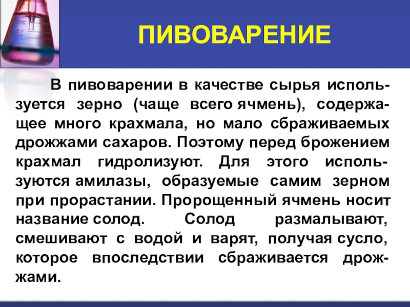 всего ячмень), содержа-щее много крахмала, но мало сбраживаемых дрожжами сахаров. Поэтому перед брожением крахмал гидролизуют. Для этого исполь-зуются амилазы, образуемые самим зерном при прорастании. Пророщенный ячмень носит название солод. Солод размалывают, смешивают с водой и варят, получая сусло, которое впоследствии сбраживается дрож-жами.