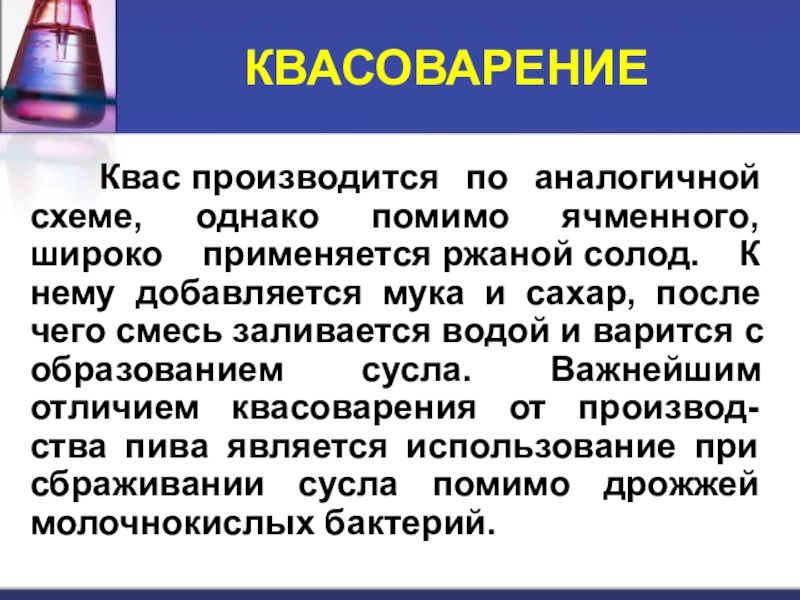 К нему добавляется мука и сахар, после чего смесь заливается водой и варится с образованием сусла. Важнейшим отличием квасоварения от производ-ства пива является использование при сбраживании сусла помимо дрожжей молочнокислых бактерий.