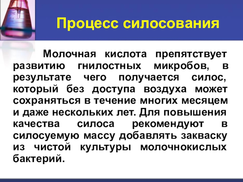 чего получается силос, который без доступа воздуха может сохраняться в течение многих месяцем и даже нескольких лет. Для повышения качества силоса рекомендуют в силосуемую массу добавлять закваску из чистой культуры молочнокислых бактерий.