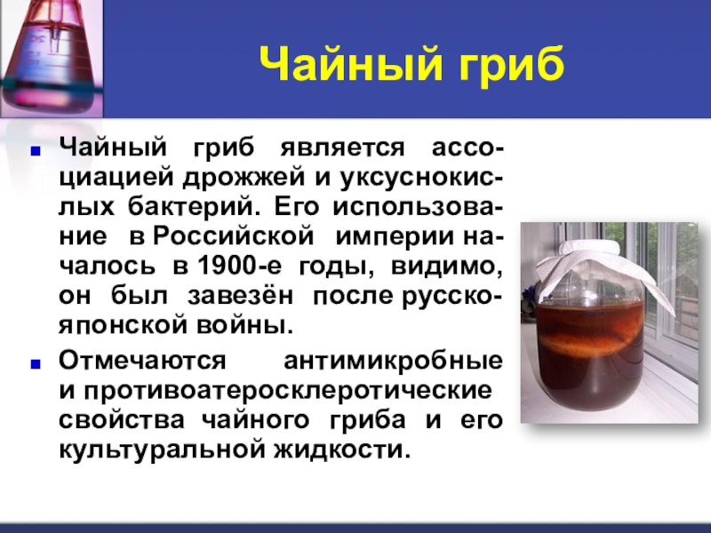 Чайный гриб является ассо-циацией дрожжей и уксуснокис-лых бактерий. Его использова-ние