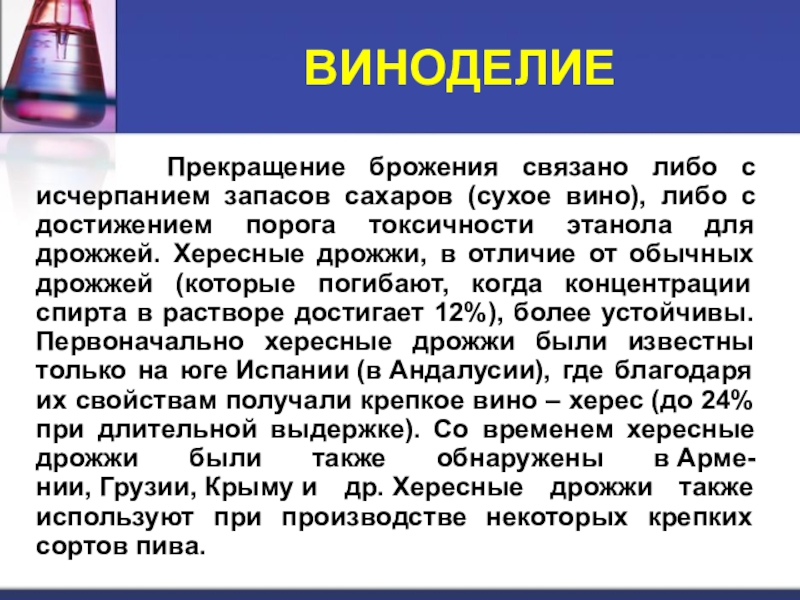 (сухое вино), либо с достижением порога токсичности этанола для дрожжей. Хересные дрожжи, в отличие от обычных дрожжей (которые погибают, когда концентрации спирта в растворе достигает 12%), более устойчивы. Первоначально хересные дрожжи были известны только на юге Испании (в Андалусии), где благодаря их свойствам получали крепкое вино – херес (до 24% при длительной выдержке). Со временем хересные дрожжи были также обнаружены в Арме-нии, Грузии, Крыму и др. Хересные дрожжи также используют при производстве некоторых крепких сортов пива.