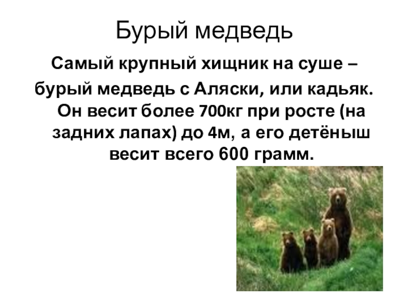 или кадьяк. Он весит более 700кг при росте (на задних лапах) до 4м, а его детёныш весит всего 600 грамм.