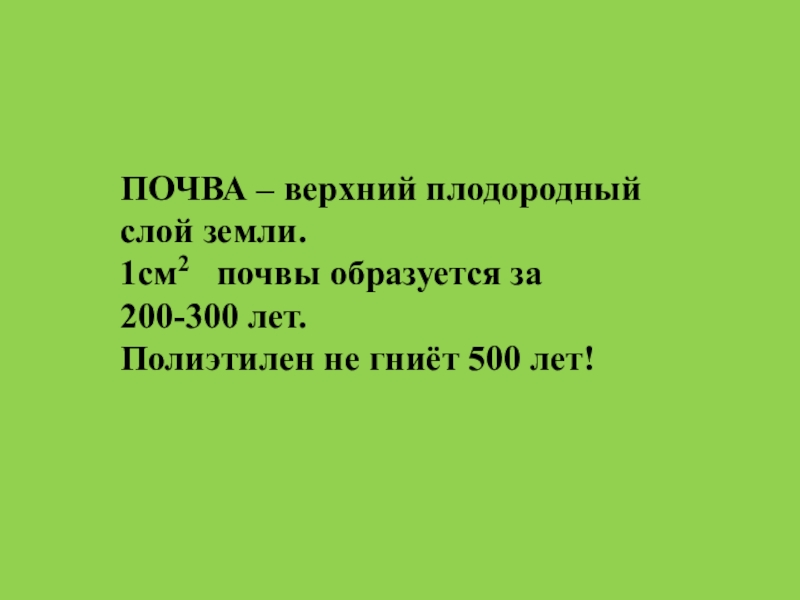 ПОЧВА – верхний плодородный слой земли.1см2  почвы образуется за 200-300 лет.Полиэтилен не гниёт 500 лет!