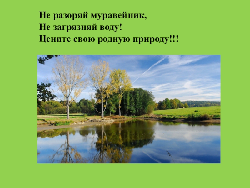 Не разоряй муравейник,Не загрязняй воду!Цените свою родную природу!!!
