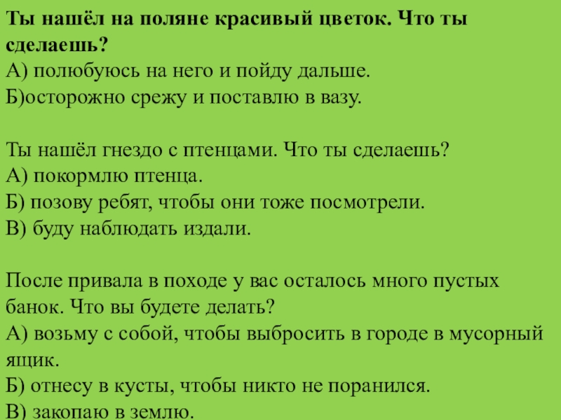 Ты нашёл на поляне красивый цветок. Что ты сделаешь?А) полюбуюсь на него и пойду дальше.Б)осторожно срежу и