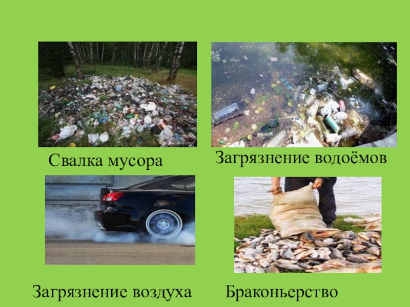 Свалка мусораЗагрязнение водоёмовЗагрязнение воздухаБраконьерство