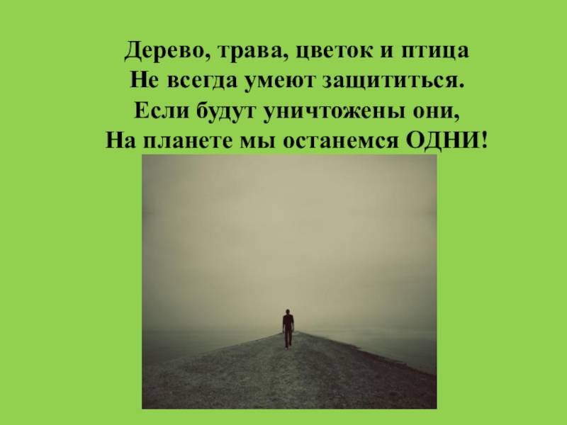 Дерево, трава, цветок и птицаНе всегда умеют защититься.Если будут уничтожены они,На планете мы останемся ОДНИ!
