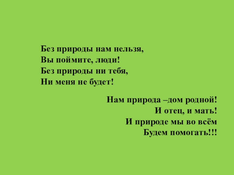 Без природы нам нельзя,Вы поймите, люди!Без природы ни тебя,Ни меня не будет!Нам природа –дом родной!И отец, и