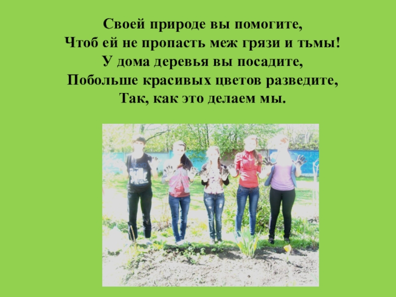 Своей природе вы помогите,Чтоб ей не пропасть меж грязи и тьмы!У дома деревья вы посадите,Побольше красивых цветов