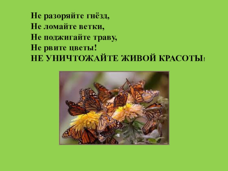 Не разоряйте гнёзд,Не ломайте ветки,Не поджигайте траву, Не рвите цветы!НЕ УНИЧТОЖАЙТЕ ЖИВОЙ КРАСОТЫ!
