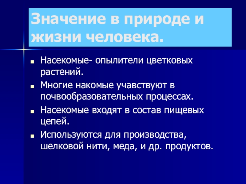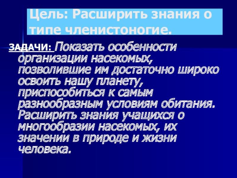 им достаточно широко освоить нашу планету, приспособиться к самым разнообразным условиям обитания. Расширить знания учащихся о многообразии насекомых, их значении в природе и жизни человека.