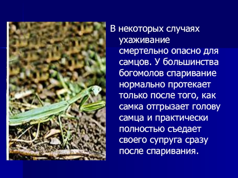 В некоторых случаях ухаживание смертельно опасно для самцов. У большинства богомолов