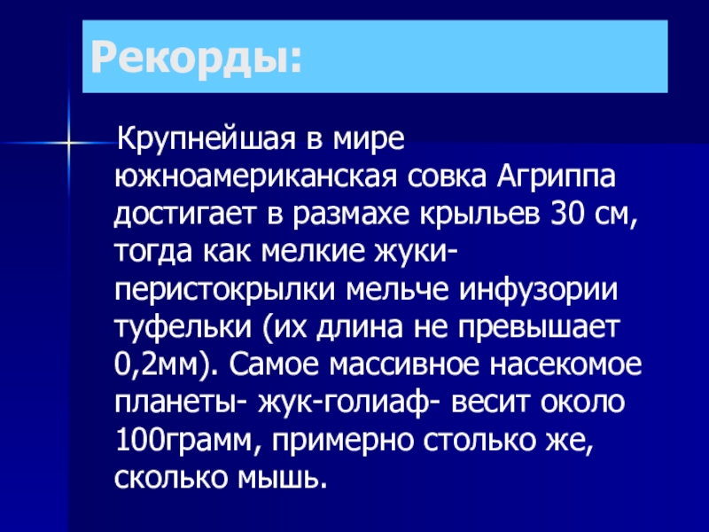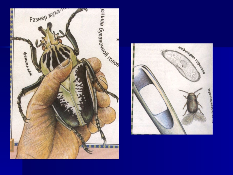 крыльев 30 см, тогда как мелкие жуки-перистокрылки мельче инфузории туфельки (их длина не превышает 0,2мм). Самое массивное насекомое планеты- жук-голиаф- весит около 100грамм, примерно столько же, сколько мышь.