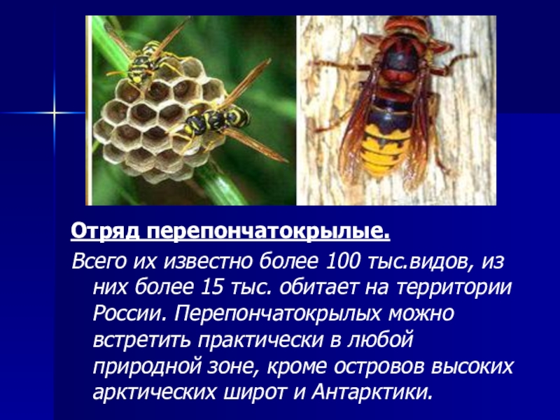 тыс. обитает на территории России. Перепончатокрылых можно встретить практически в любой природной зоне, кроме островов высоких арктических широт и Антарктики.