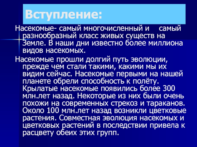Насекомые прошли долгий путь эволюции, прежде чем стали такими, какими мы их видим сейчас. Насекомые первыми на нашей планете обрели способность к полёту. Крылатые насекомые появились более 300 млн.лет назад. Некоторые из них были очень похожи на современных стрекоз и тараканов. Около 100 млн.лет назад возникли цветковые растения. Совместная эволюция насекомых и цветковых растений в последствии привела к расцвету обеих этих групп.