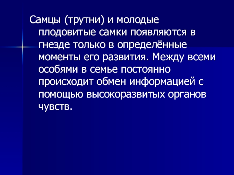 Самцы (трутни) и молодые плодовитые самки появляются в гнезде только в