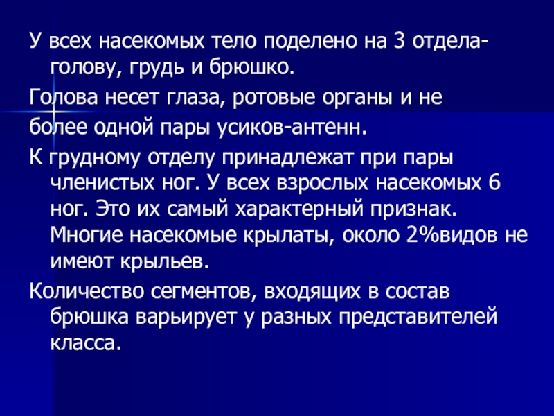 К грудному отделу принадлежат при пары членистых ног. У всех взрослых насекомых 6 ног. Это их самый характерный признак. Многие насекомые крылаты, около 2%видов не имеют крыльев.