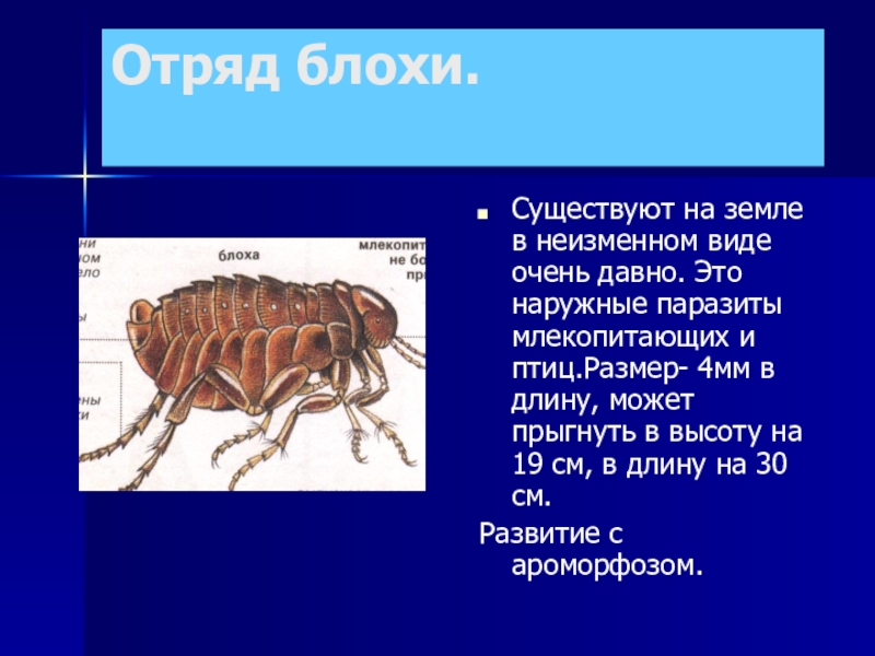 паразиты млекопитающих и птиц.Размер- 4мм в длину, может прыгнуть в высоту на 19 см, в длину на 30 см.