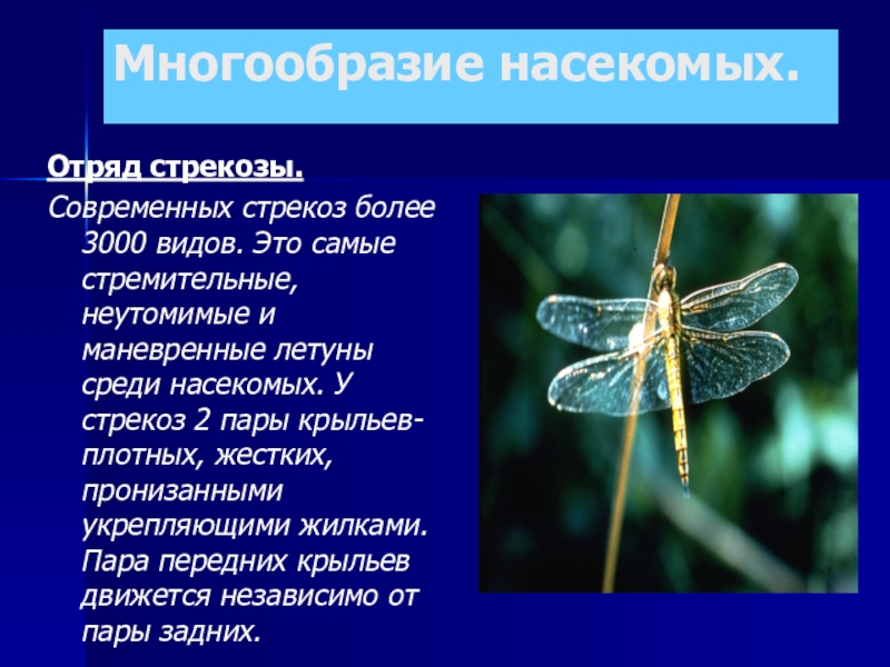 и маневренные летуны среди насекомых. У стрекоз 2 пары крыльев- плотных, жестких, пронизанными укрепляющими жилками. Пара передних крыльев движется независимо от пары задних.