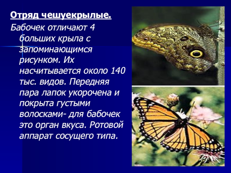 около 140 тыс. видов. Передняя пара лапок укорочена и покрыта густыми волосками- для бабочек это орган вкуса. Ротовой аппарат сосущего типа.