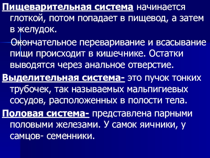 Окончательное переваривание и всасывание пищи происходит в кишечнике. Остатки выводятся через анальное отверстие.