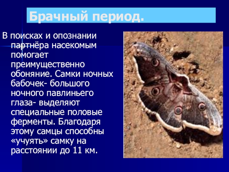 ночных бабочек- большого ночного павлиньего глаза- выделяют специальные половые ферменты. Благодаря этому самцы способны «учуять» самку на расстоянии до 11 км.