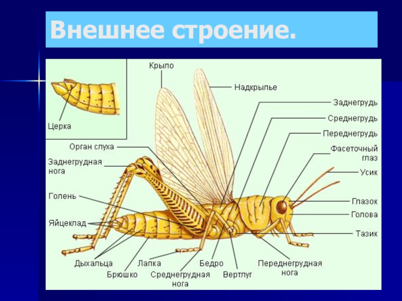 Тело насекомых заключено в наружный панцирь- скелет, преимущественно состоящий из хитина.
