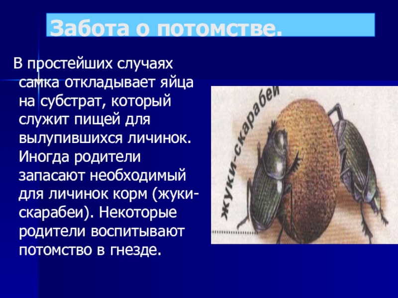 который служит пищей для вылупившихся личинок. Иногда родители запасают необходимый для личинок корм (жуки-скарабеи). Некоторые родители воспитывают потомство в гнезде.