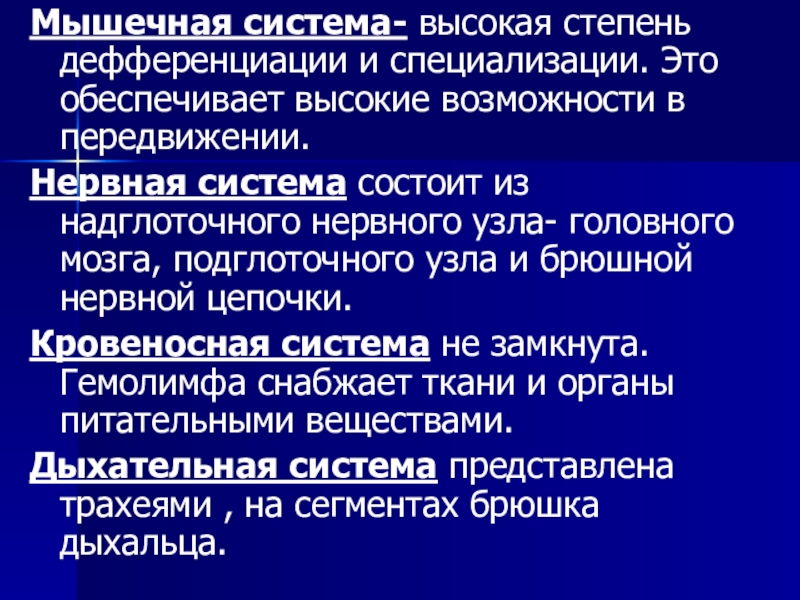 Мышечная система- высокая степень дефференциации и специализации. Это обеспечивает высокие возможности