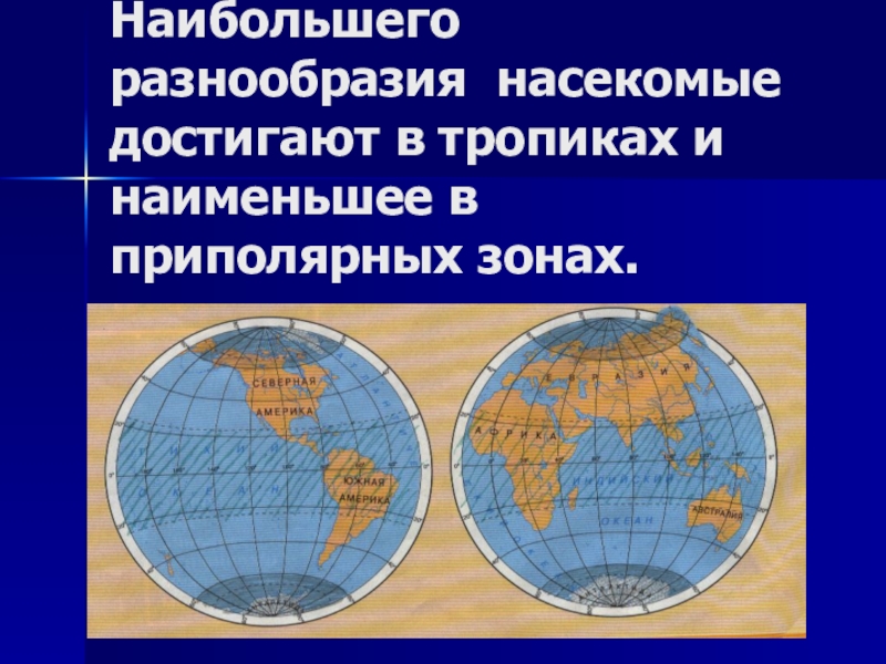 Слайд 6Наибольшего разнообразия насекомые достигают в тропиках и наименьшее в приполярных зонах.