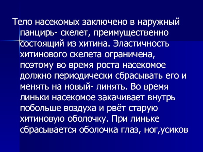 Эластичность хитинового скелета ограничена, поэтому во время роста насекомое должно периодически сбрасывать его и менять на новый- линять. Во время линьки насекомое закачивает внутрь побольше воздуха и рвёт старую хитиновую оболочку. При линьке сбрасывается оболочка глаз, ног,усиков
