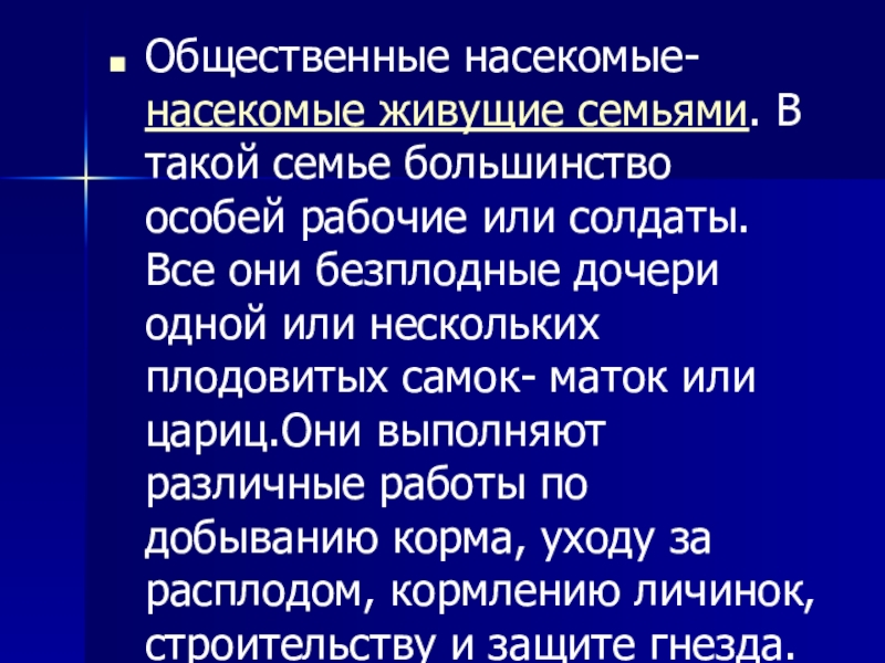 Общественные насекомые- насекомые живущие семьями. В такой семье большинство особей рабочие
