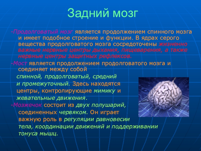 Ученые еще объединяют головной мозг в отделы: задний, средний и передний мозг.