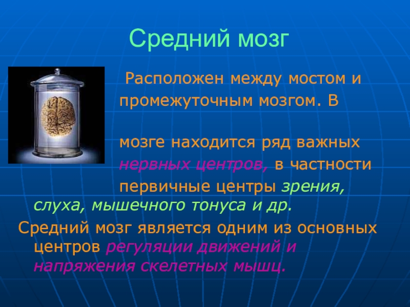 Средний мозг является одним из основных центров регуляции движений и напряжения скелетных мышц.