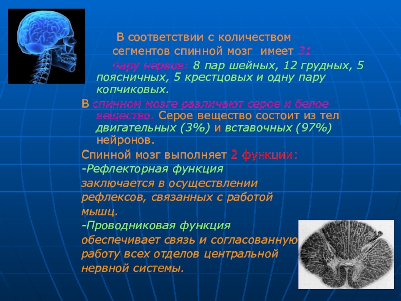 из 31 сегмента, объединенных в отделы: шейный, грудной, поясничный, крестцовый. От каждого сегмента вправо и влево отходят по паре задних и передних корешков.