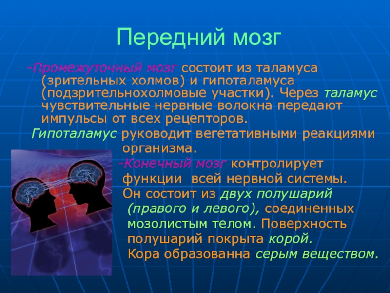 -Промежуточный мозг состоит из таламуса (зрительных холмов) и гипоталамуса (подзрительнохолмовые